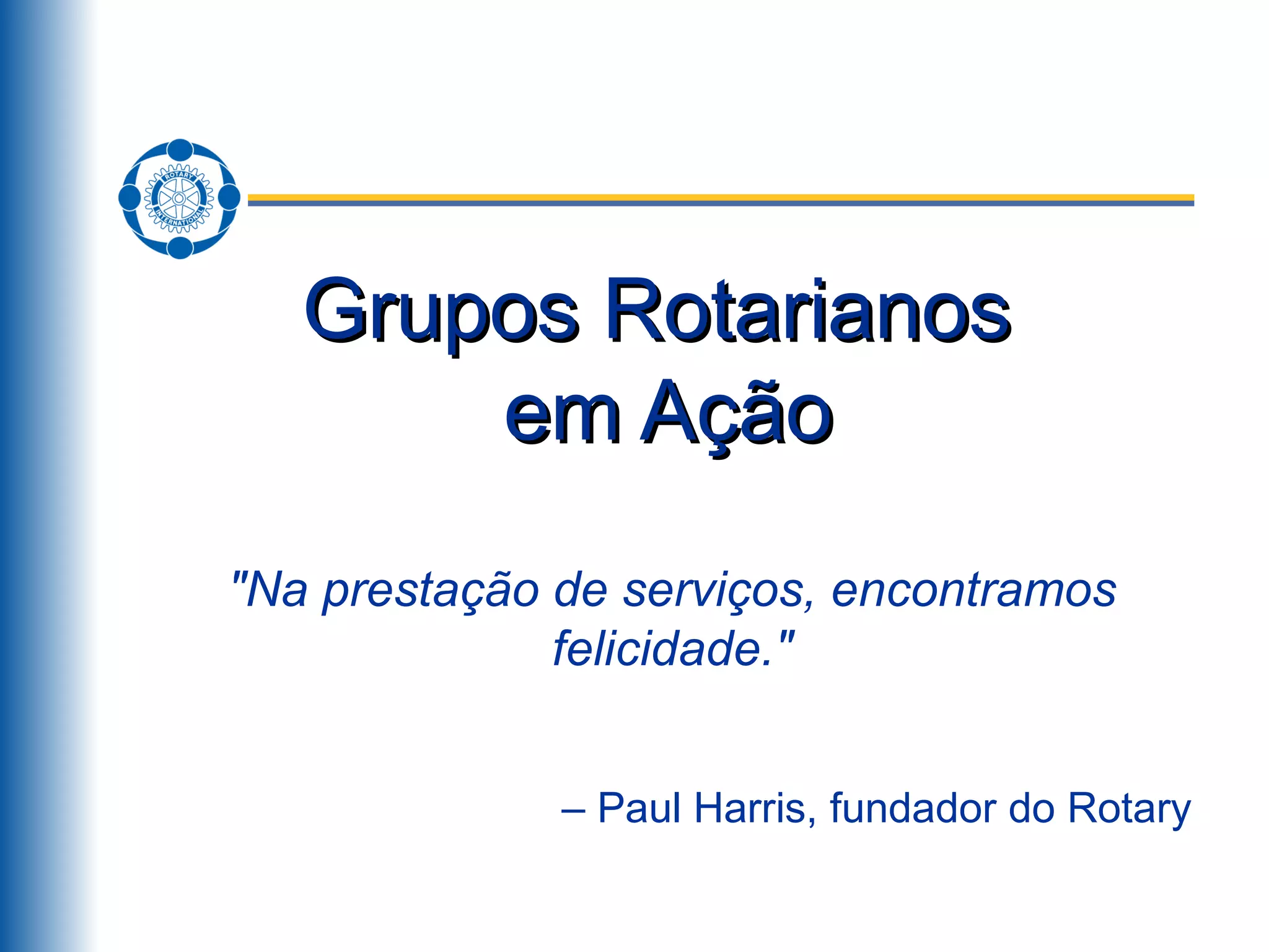 Os Grupos Rotarianos em Ação são grupos formados por rotarianos, cônjuges e rotaractianos para realizar projetos internacionais de prestação de serviços em áreas humanitárias específicas. Eles operam de forma independente seguindo as diretrizes gerais do Rotary Internacional e devem ter no mínimo 100 membros de 10 países e 3 zonas rotárias. Os grupos se reúnem na convenção internacional anual para planejar projetos e recrutar novos membros.