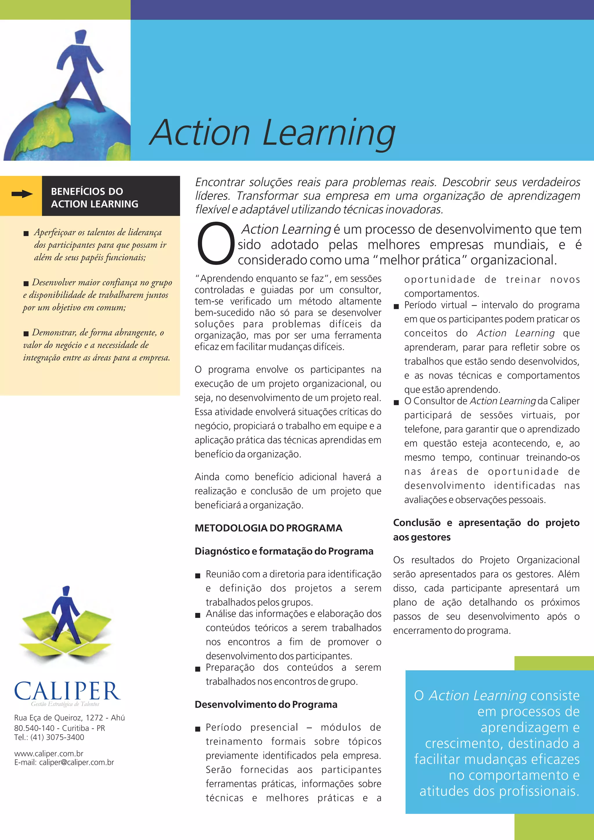 Action learning é um processo de desenvolvimento adotado por empresas líderes, focado na resolução de problemas reais e na formação de líderes. O programa envolve a execução de projetos reais que promovem trabalho em equipe e aplicação prática de técnicas aprendidas, culminando na apresentação dos resultados a gestores. Adicionalmente, oferece períodos presenciais e virtuais para formação e reflexão, visando mudanças efetivas no comportamento profissional.