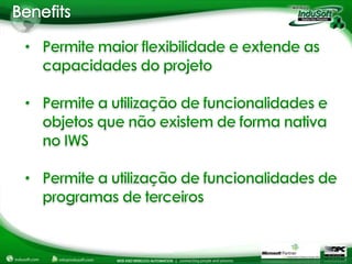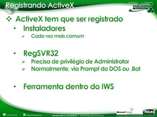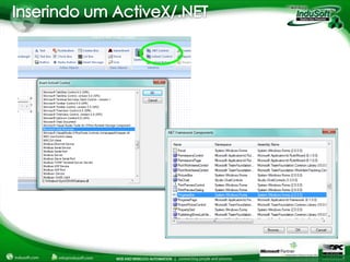 O documento fornece informações sobre controles ActiveX e .NET para uso em aplicativos web, incluindo um controle de slider Microsoft e navegador web para ActiveX, e uma barra de progresso para .NET. Também fornece detalhes de contato para suporte técnico e vendas da InduSoft nos EUA, Brasil e Alemanha.