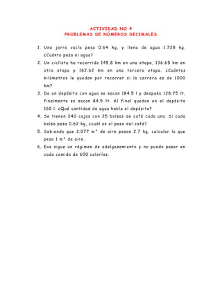 1. O documento apresenta 6 problemas envolvendo números decimais relacionados a medidas de peso, distância, volume e calorias.