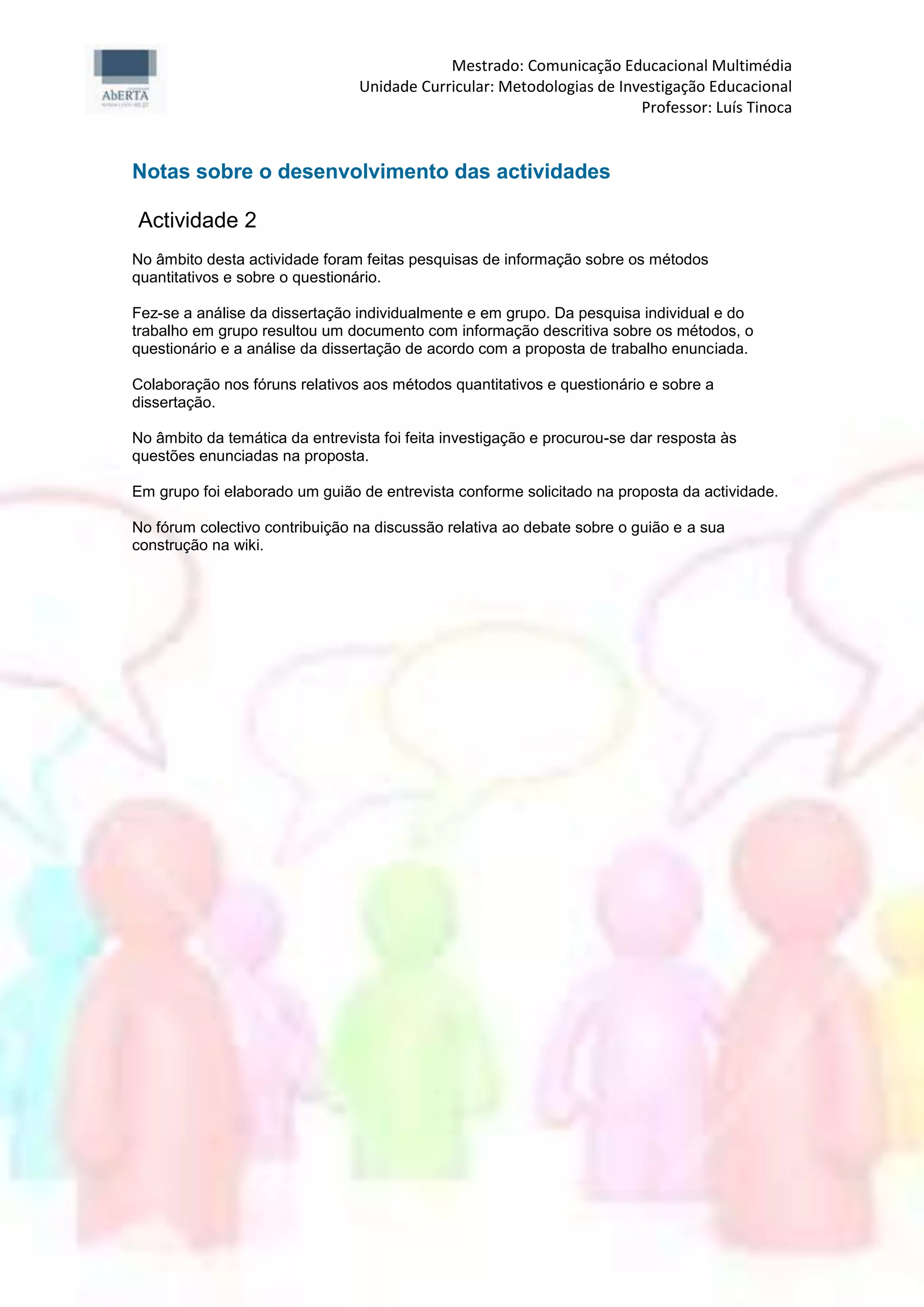 Os alunos realizaram pesquisas individuais e em grupo sobre métodos quantitativos e questionários. Eles analisaram uma dissertação individualmente e em grupo, resultando em um documento descritivo sobre os métodos e questionário de acordo com o trabalho proposto. Eles também contribuíram para fóruns sobre esses tópicos e elaboraram um roteiro de entrevista em grupo conforme solicitado.