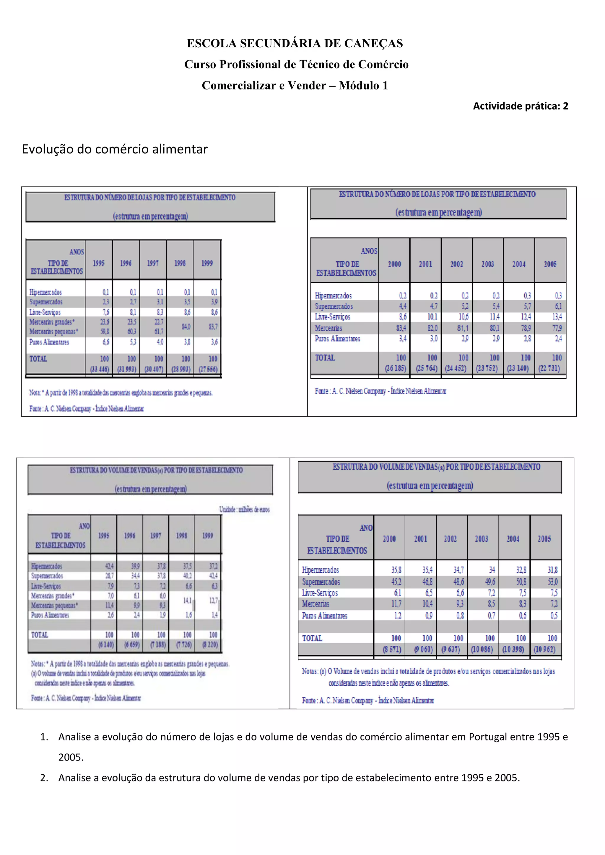 O documento descreve uma atividade prática sobre a evolução do comércio alimentar em Portugal entre 1995 e 2005. A atividade inclui analisar o número de lojas e volume de vendas, bem como a estrutura das vendas por tipo de estabelecimento durante esse período.