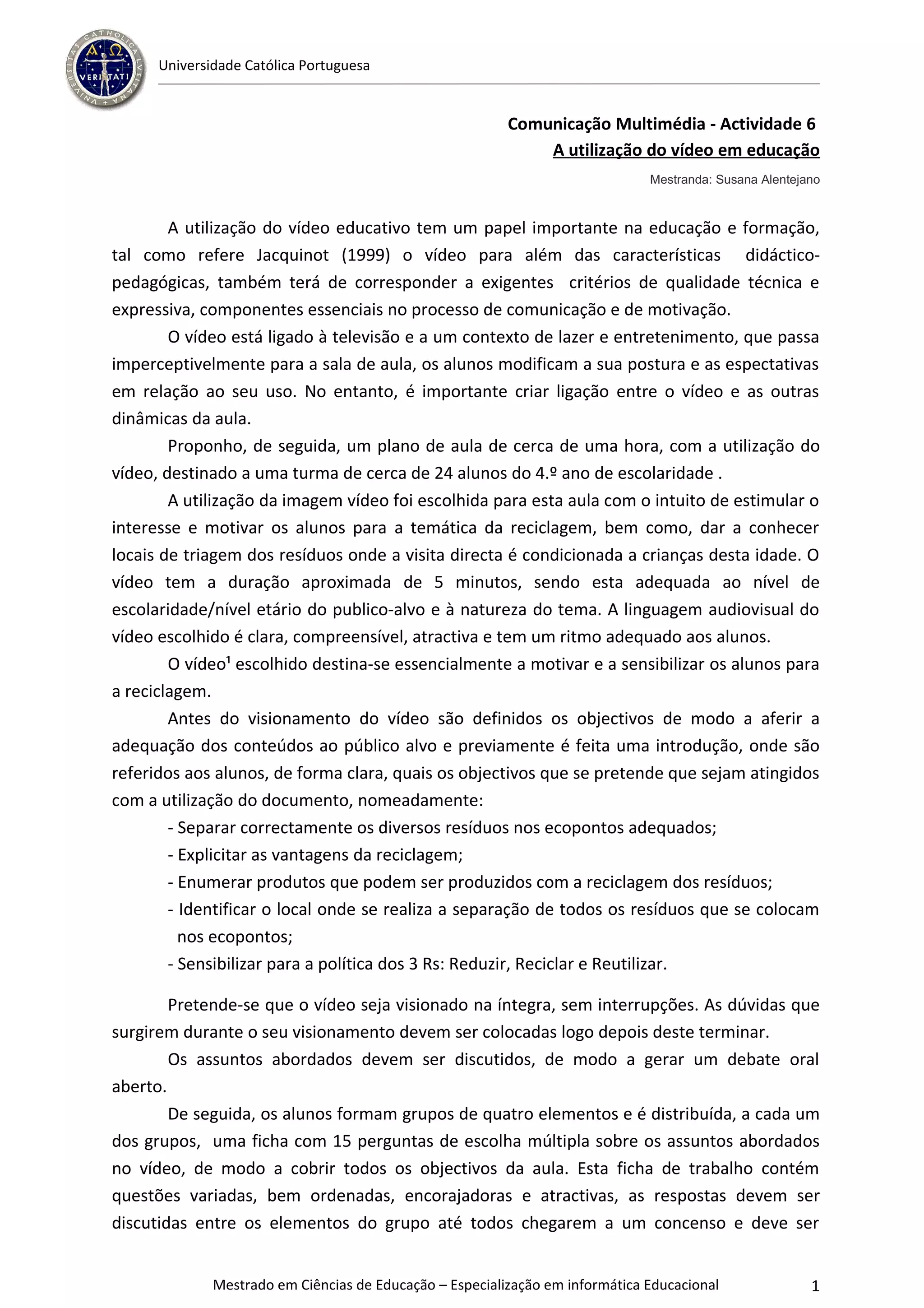 Este documento propõe um plano de aula de uma hora para alunos do 4o ano utilizando vídeo para ensinar sobre reciclagem. O vídeo é usado para motivar os alunos e ensinar sobre separação correta de resíduos e benefícios da reciclagem. As atividades incluem discussão, questionários em grupo e jogos sobre reciclagem para consolidar o aprendizado.