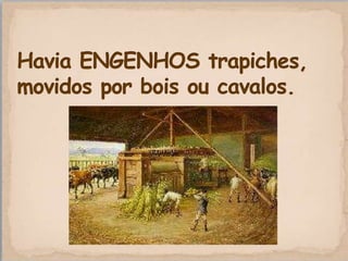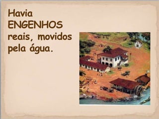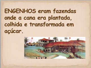O documento descreve como funcionava um engenho de açúcar no Brasil colonial, incluindo o processo de produção do açúcar a partir da cana-de-açúcar e o trabalho realizado pelos escravos nas lavouras e na casa grande. Também contrasta a vida dos senhores proprietários com a dura realidade dos escravos, e como a exploração excessiva da terra no Nordeste levou à pobreza atual na região.