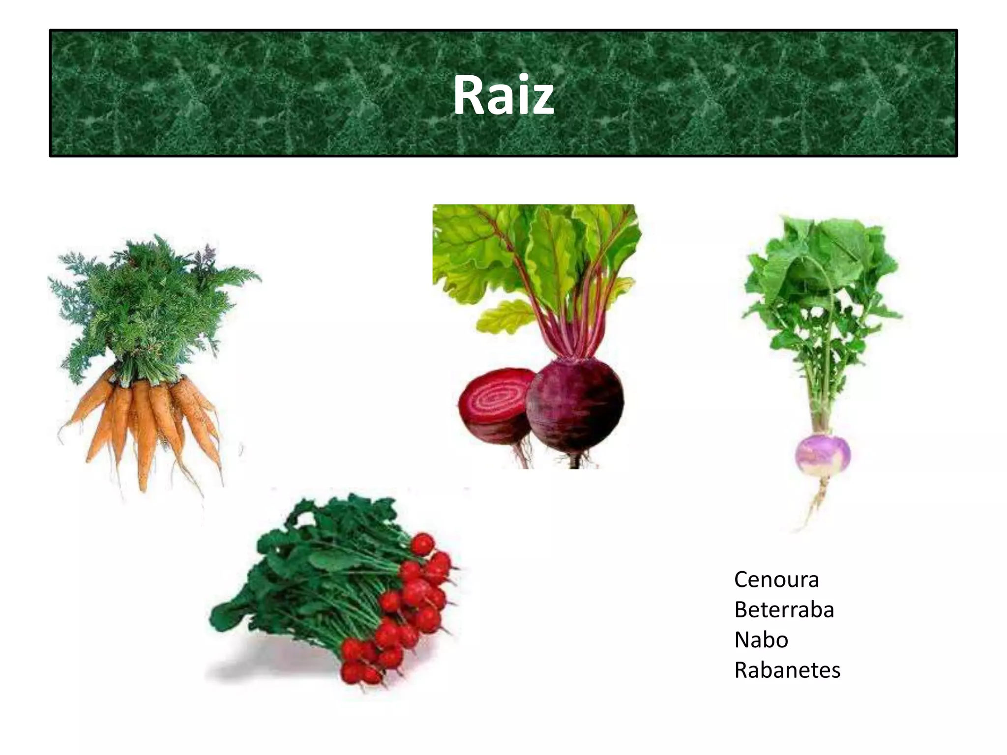 As partes comestíveis das plantas são classificadas em raiz, caule, folha, flor, fruto e sementes. Exemplos de raízes são cenoura, beterraba e nabo. Cebola, alho e batata são exemplos de caules comestíveis. Alface, coentros e hortelã são exemplos de folhas comestíveis.