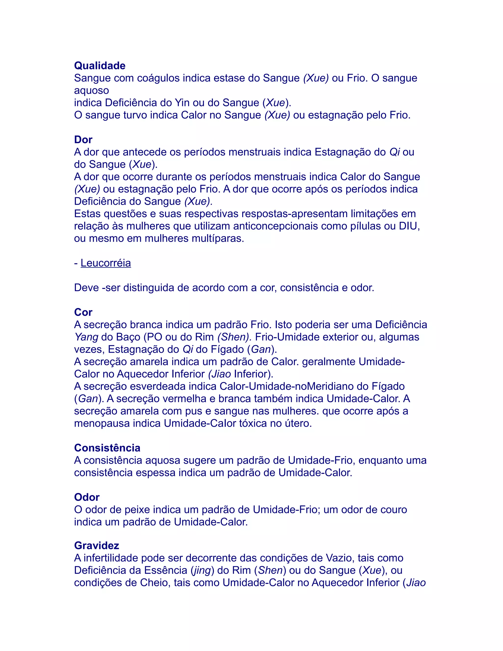 1) O documento discute sinais e sintomas da medicina tradicional chinesa relacionados à qualidade do sangue, dor, leucorréia, gravidez, parto e crianças.