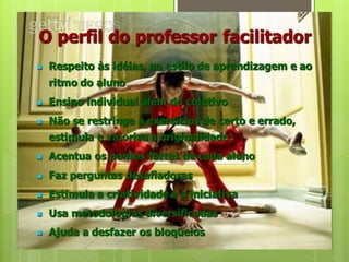 O documento discute a necessidade de superar a pedagogia da transmissão em favor de uma abordagem mais colaborativa e centrada no aluno. Defende que as novas tecnologias permitem novas formas de ensino-aprendizagem interativas que envolvem troca, trabalho em grupo e pesquisa. Além disso, critica o modelo tradicional de educação baseado na transmissão e defende que os professores devem ser mediadores que estimulem os alunos a pensar e aprender por si mesmos.