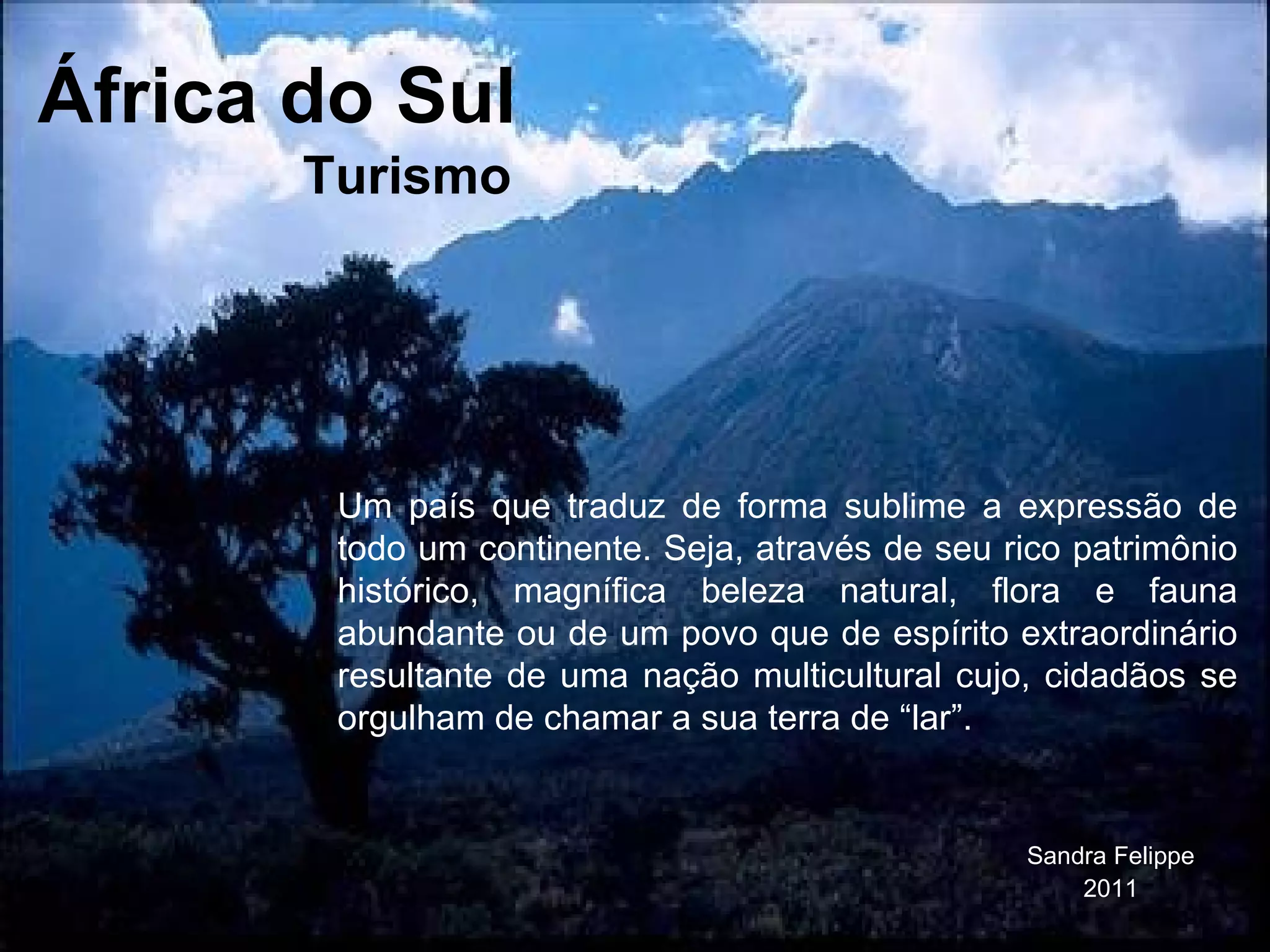 África do SulSandra Felippe 2011 Um país que traduz de forma sublime a expressão de todo um continente. Seja, através de seu rico patrimônio histórico, magnífica beleza natural, flora e fauna abundante ou de um povo que de espírito extraordinário resultante de uma nação multicultural cujo, cidadãos se orgulham de chamar a sua terra de “lar”. Turismo