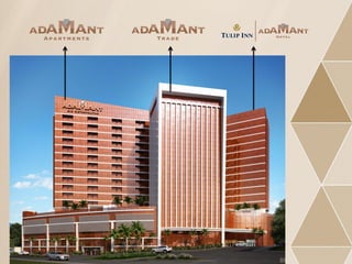 O documento descreve um empreendimento imobiliário localizado em São João de Meriti, RJ, chamado Adamant. O complexo misto oferece unidades hoteleiras, salas comerciais e apartamentos para longa estadia, além de serviços como restaurante, academia e estacionamento.