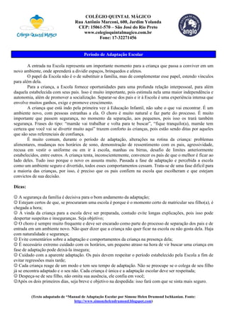 O documento discute o período de adaptação escolar das crianças, explicando que é natural que sintam medo do novo ambiente e chorem na separação dos pais. Também dá dicas aos pais para ajudar na adaptação, como passar segurança e respeitar o tempo de cada criança.
