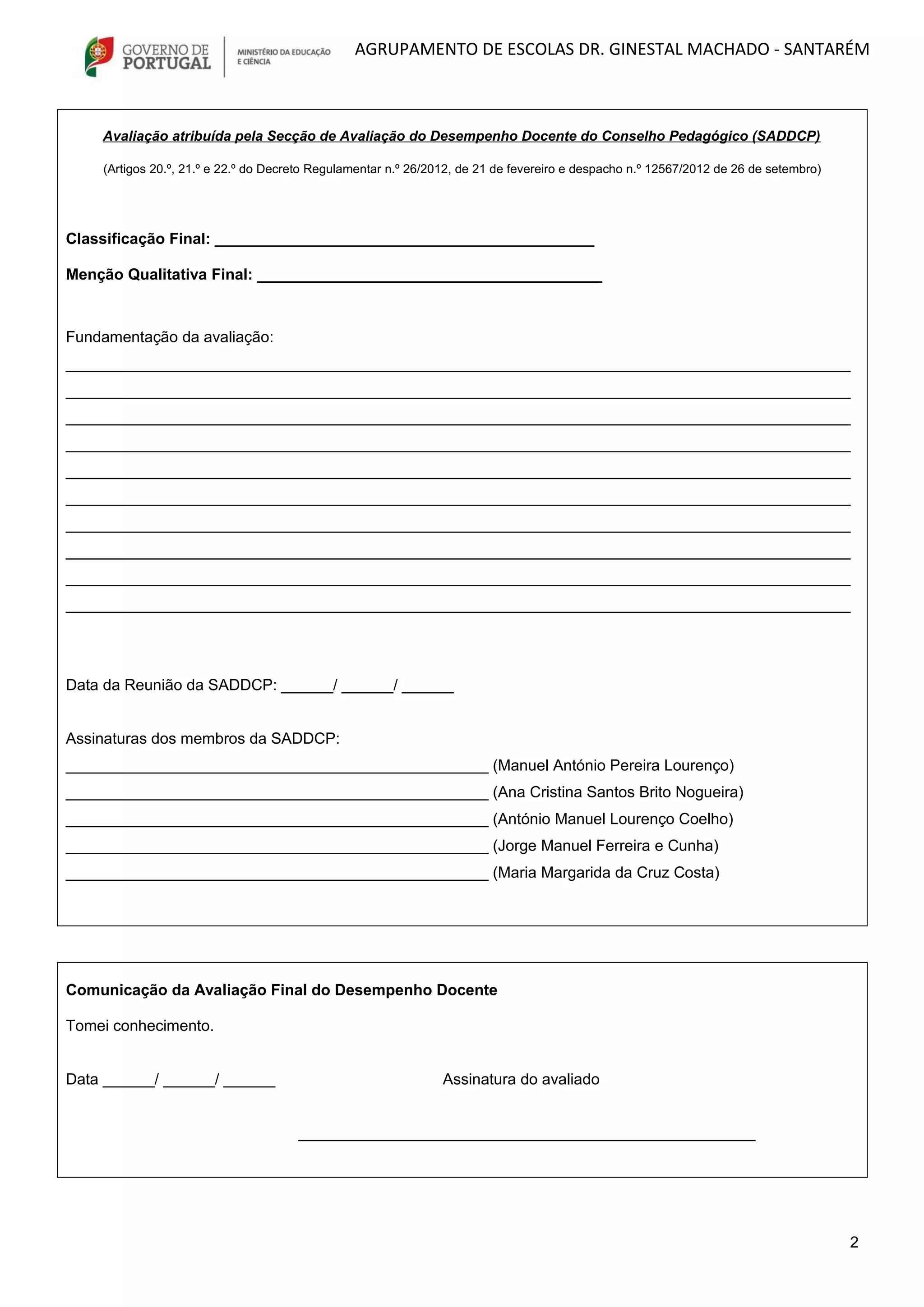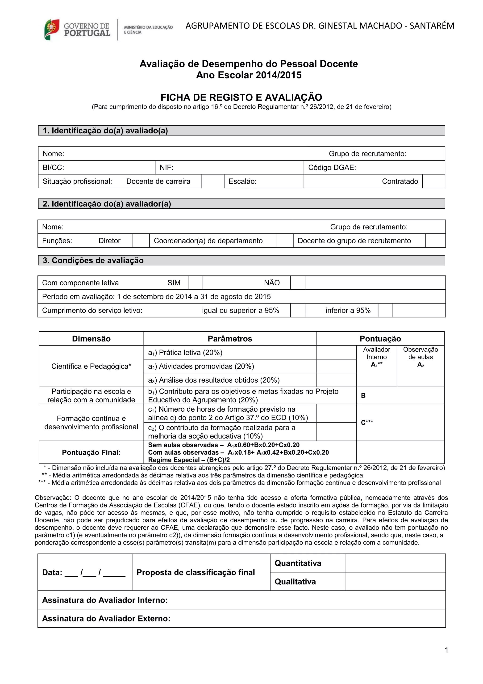 Este documento descreve o processo de avaliação de desempenho de um professor no Agrupamento de Escolas Dr. Ginestal Machado em Santarém para o ano letivo de 2014/2015, incluindo a identificação do professor e avaliador, os parâmetros avaliados em diferentes dimensões, e a classificação final atribuída pelo Conselho Pedagógico.