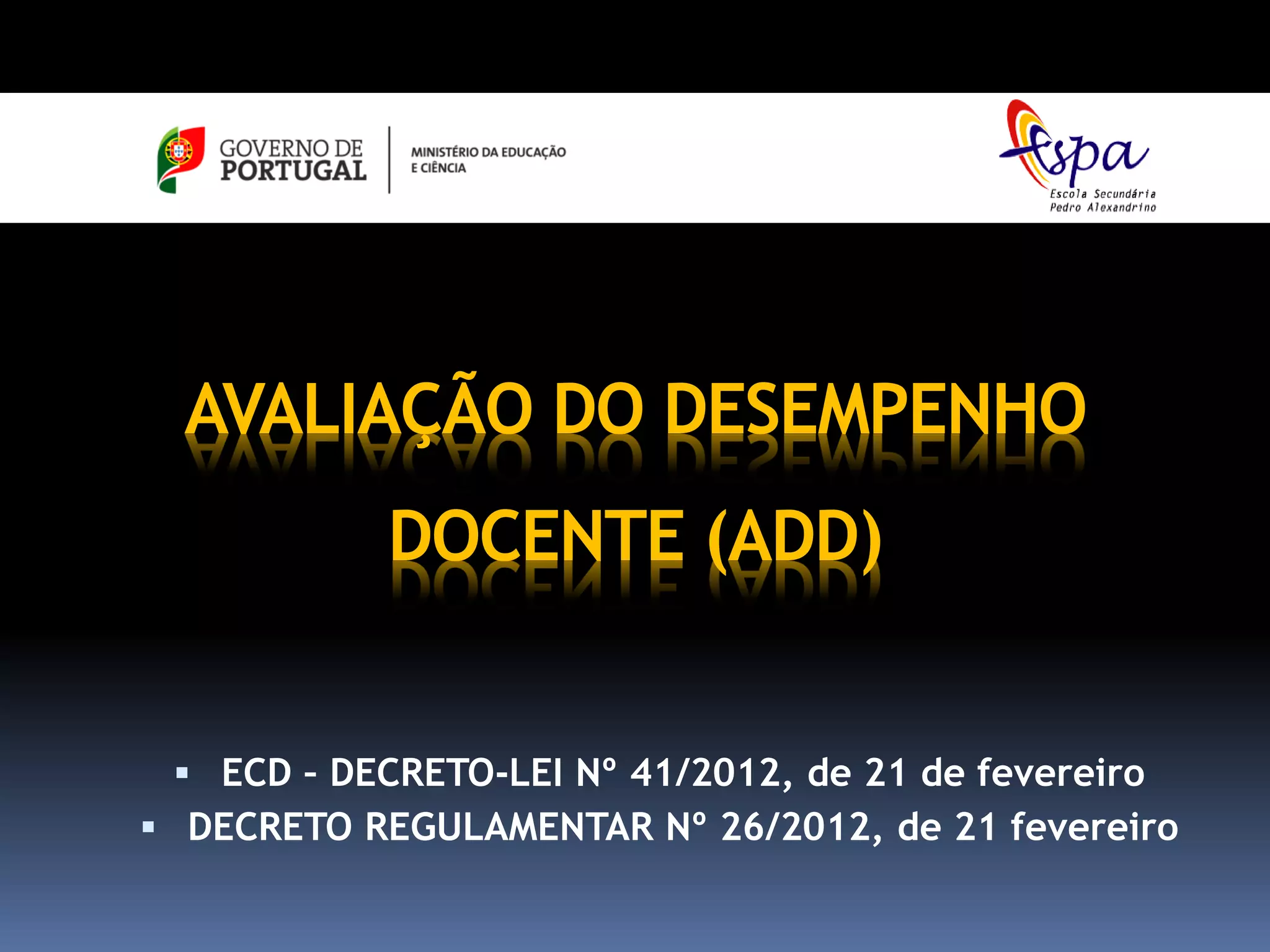 Este documento descreve o processo de avaliação do desempenho docente em Portugal, definindo seus objetivos, dimensões, periodicidade, intervenientes, documentos e resultados. O processo visa melhorar a qualidade educativa e valorizar os professores, avaliando suas atividades pedagógicas, participação na escola e formação contínua.