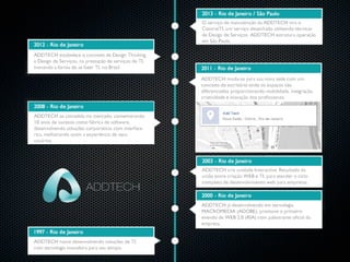 A Addtech é uma empresa de outsourcing e desenvolvimento de software com 200 profissionais em São Paulo e Rio de Janeiro. Ela oferece terceirização parcial ou total de times e processos em diversas tecnologias como Java, .NET, e design mobile e web com foco no usuário. A Addtech utiliza metodologias ágeis e de gestão de projetos para garantir qualidade e entregas dentro do escopo e prazo acordados.