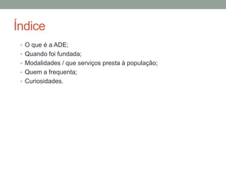 A Associação Desportiva da Estação (ADE) é uma instituição fundada em 1976 na Covilhã que promove atividades desportivas como futebol, xadrez e ginástica para associados de todas as idades, especialmente crianças. A ADE tem sua sede no Largo da Estação e um complexo desportivo próximo que oferece vários serviços à população.