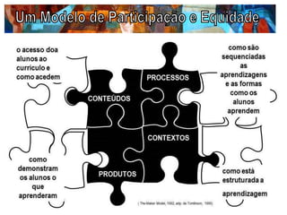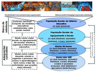 O documento discute a importância da individualização e adequação curricular no processo de ensino-aprendizagem, enfatizando que as escolas devem adaptar práticas curriculares às necessidades específicas de cada aluno. Propõe que toda a equipe colaborativa envolva-se na planificação, considerando os diferentes estilos de aprendizagem, comportamentos e necessidades dos alunos. Além disso, apresenta estratégias específicas para garantir a participação e o sucesso de todos os alunos, independentemente de suas condições ou contextos educacionais.