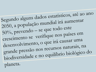 O documento discute o conceito de desenvolvimento sustentável e como garantir a sustentabilidade do planeta. Ele explica que o desenvolvimento sustentável permite satisfazer as necessidades das gerações atuais sem comprometer as futuras gerações e que a exploração dos recursos está acima de sua capacidade de reposição natural, levando a desequilíbrios, agravados pelo crescimento populacional.