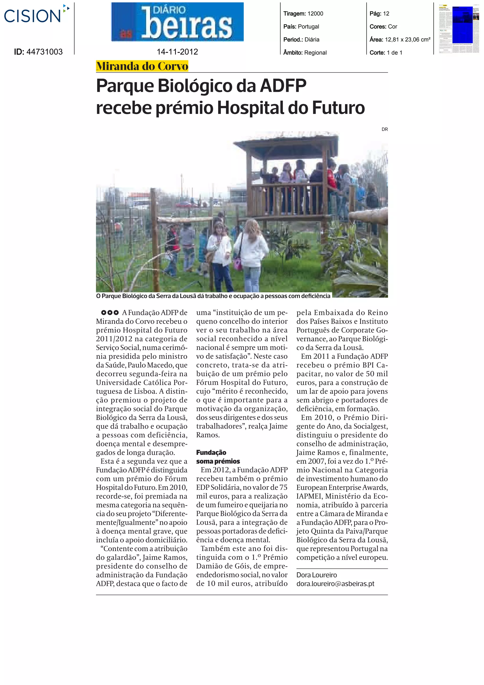 O Parque Biológico da ADFP em Miranda do Corvo recebeu o prémio Hospital do Futuro 2011/2012 na categoria de Serviço Social pelo seu projeto de integração social que dá trabalho e ocupação a pessoas com deficiência, doença mental ou desempregados de longa duração. Esta é a segunda vez que a Fundação ADFP recebe este prémio, tendo sido premiada anteriormente em 2010. O presidente da Fundação se mostra satisfeito com o reconhecimento do trabalho realizado.