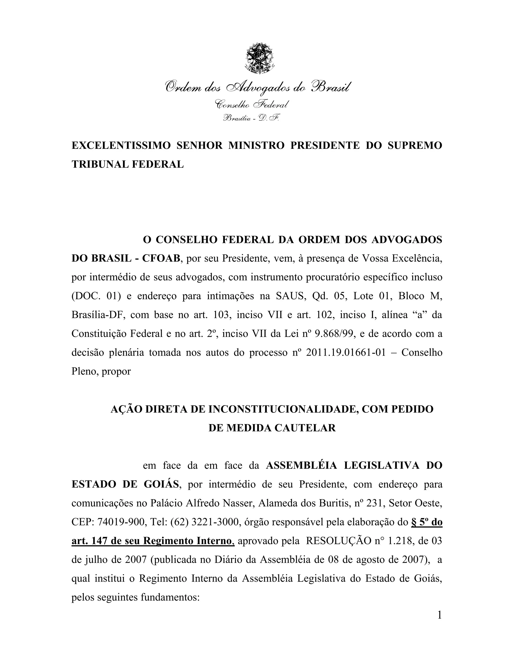 1) O Conselho Federal da Ordem dos Advogados do Brasil propõe uma Ação Direta de Inconstitucionalidade contra o §5o do artigo 147 do Regimento Interno da Assembléia Legislativa do Estado de Goiás, que permite o pagamento de verba indenizatória por sessões extraordinárias.