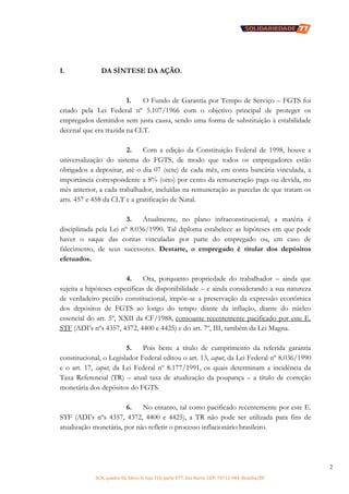 O documento descreve uma ação direta de inconstitucionalidade proposta pelo partido político Solidariedade contra a correção das contas vinculadas do FGTS pela Taxa Referencial. A ação alega que a TR não reflete adequadamente a inflação e viola os direitos de propriedade e ao FGTS garantidos na Constituição.
