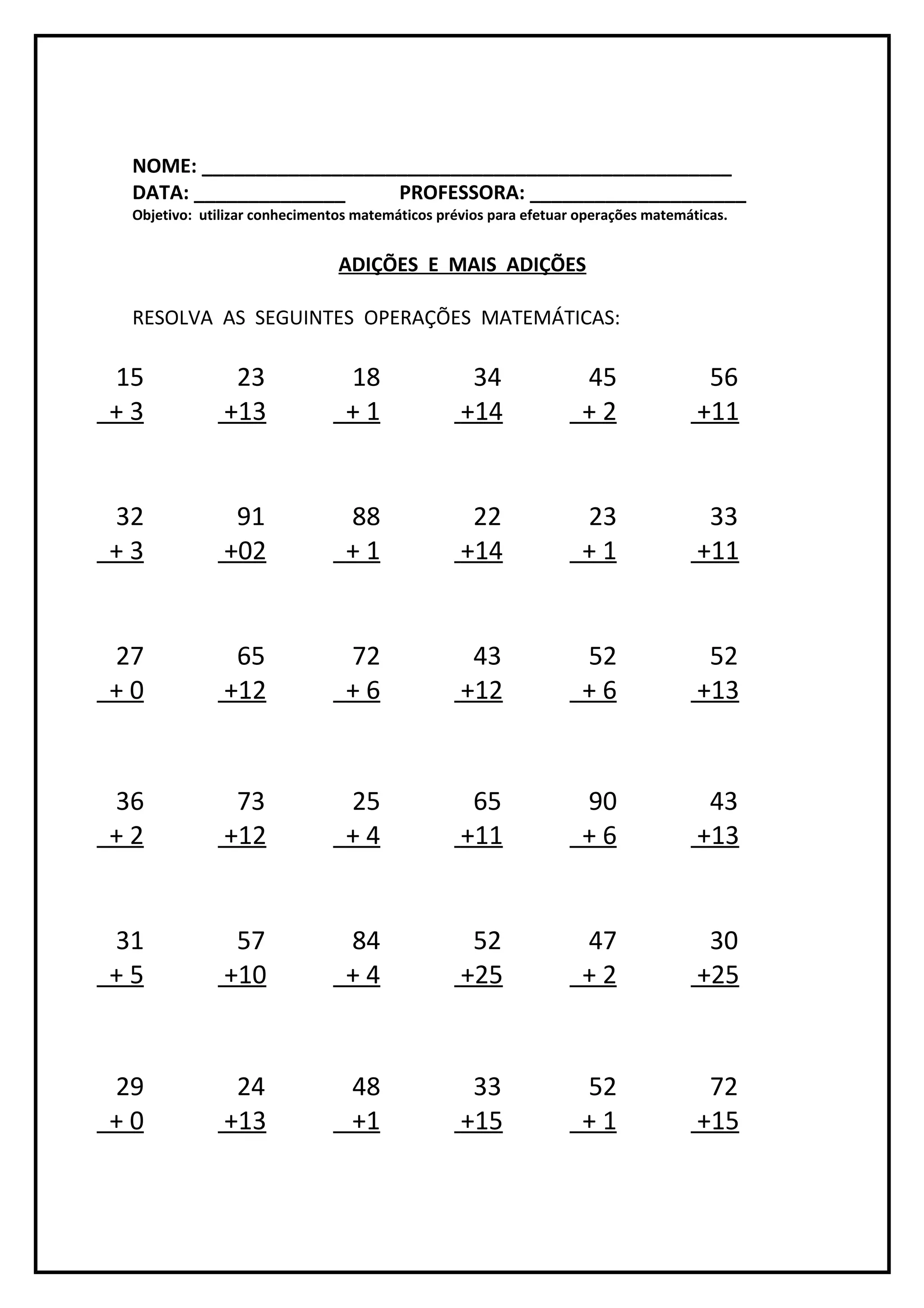 O documento apresenta uma lista de operações matemáticas de adição para serem resolvidas, com o objetivo de utilizar conhecimentos prévios de matemática para realizar cálculos.