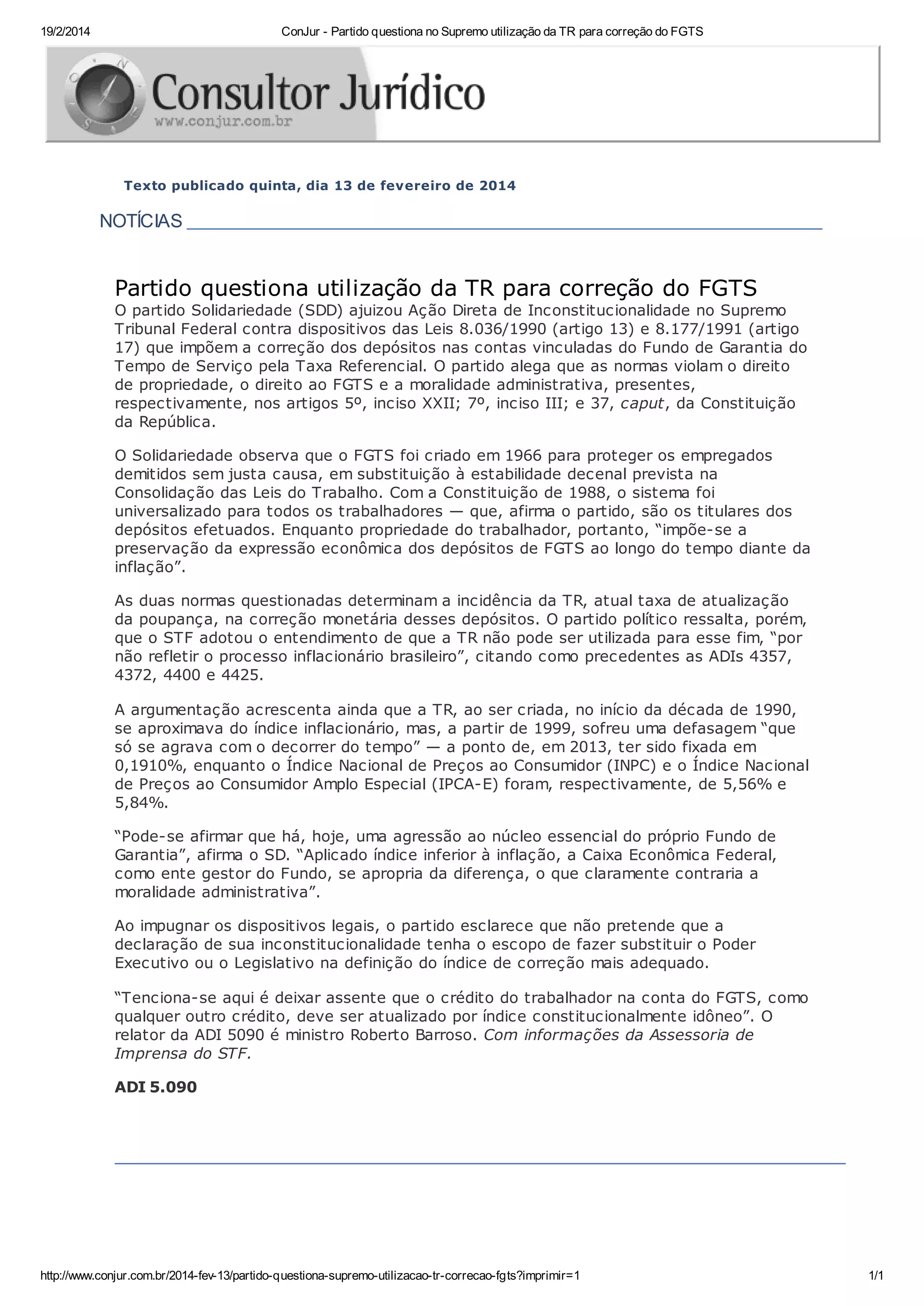 O partido Solidariedade questionou no Supremo Tribunal Federal a constitucionalidade da utilização da taxa referencial (TR) para correção do Fundo de Garantia do Tempo de Serviço (FGTS), argumentando que isso viola direitos de propriedade e moralidade administrativa. O partido destaca que a TR não reflete corretamente a inflação, o que prejudica os trabalhadores titulares das contas do FGTS. A ação busca assegurar que a atualização dos depósitos seja feita por um índice que respeite os direitos constitucionais dos trabalhadores.