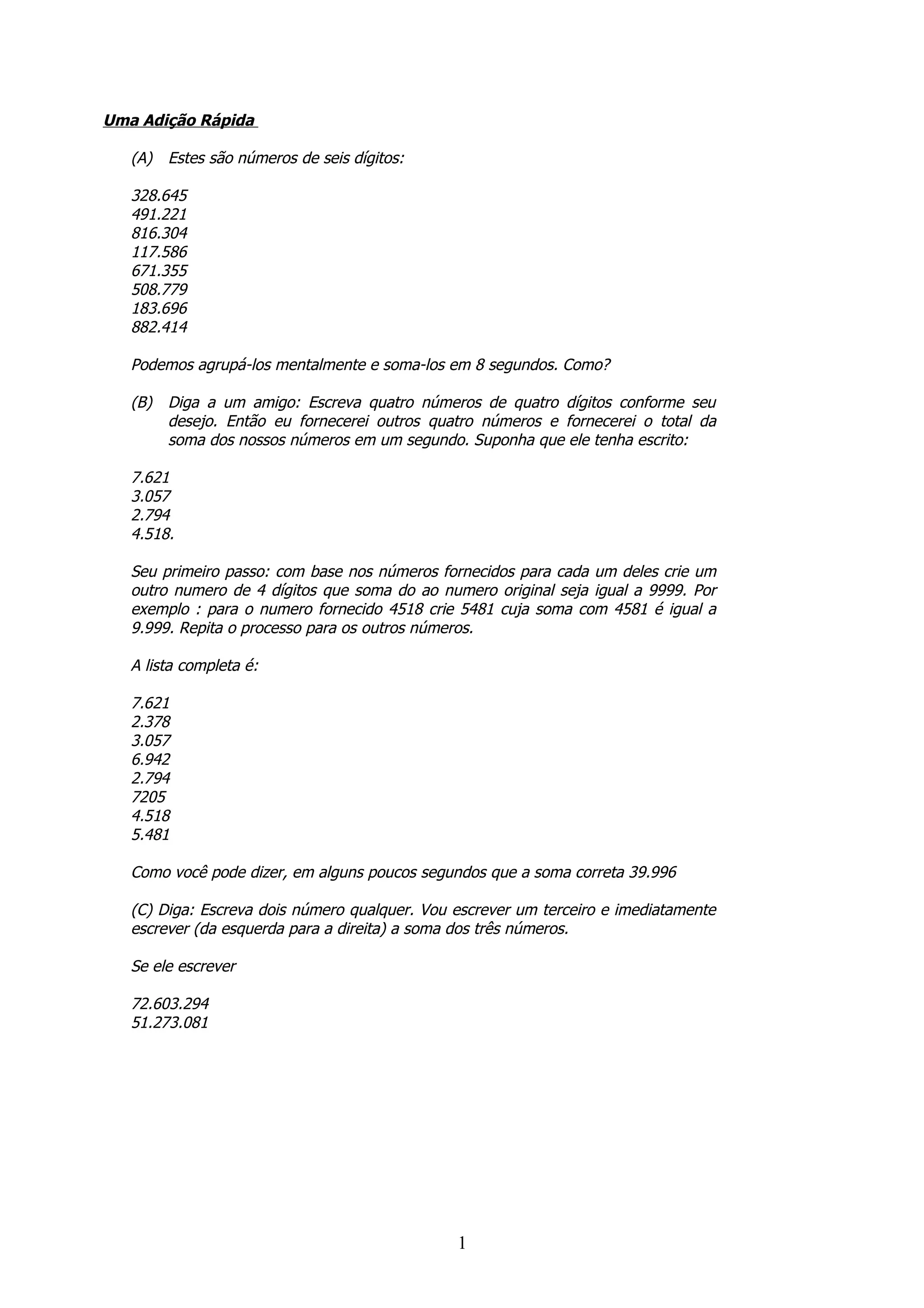 O documento apresenta três métodos para realizar somas rápidas de números de vários dígitos explorando padrões nas unidades e dezenas dos números. No primeiro método, os dígitos se complementam para somar 9 ou 10. No segundo, os números são agrupados em pares que somam 9999. No terceiro, o terceiro número é escolhido de modo que a soma dos dígitos com o segundo número some a 9.