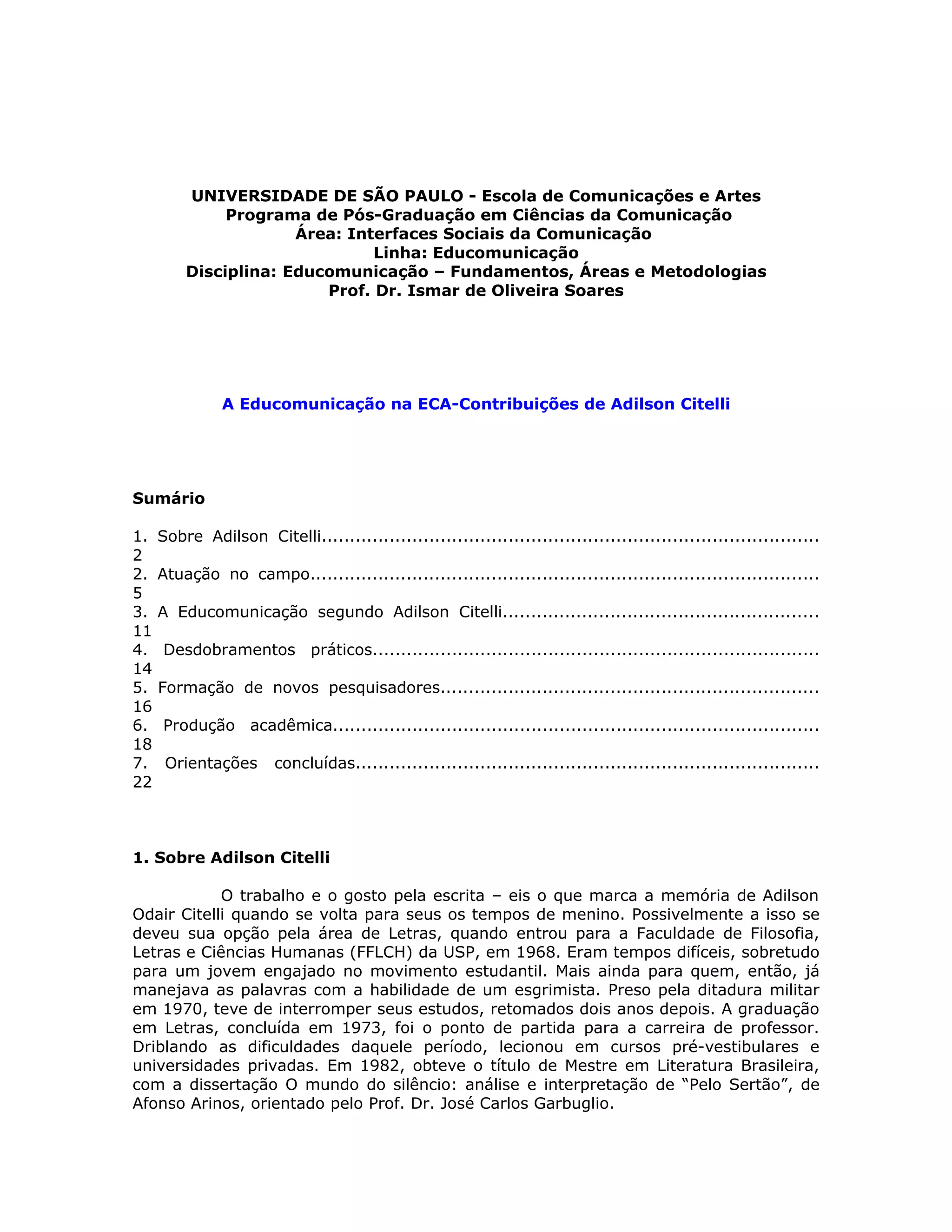1. O documento descreve a trajetória e contribuições de Adilson Citelli para o campo da Educomunicação.