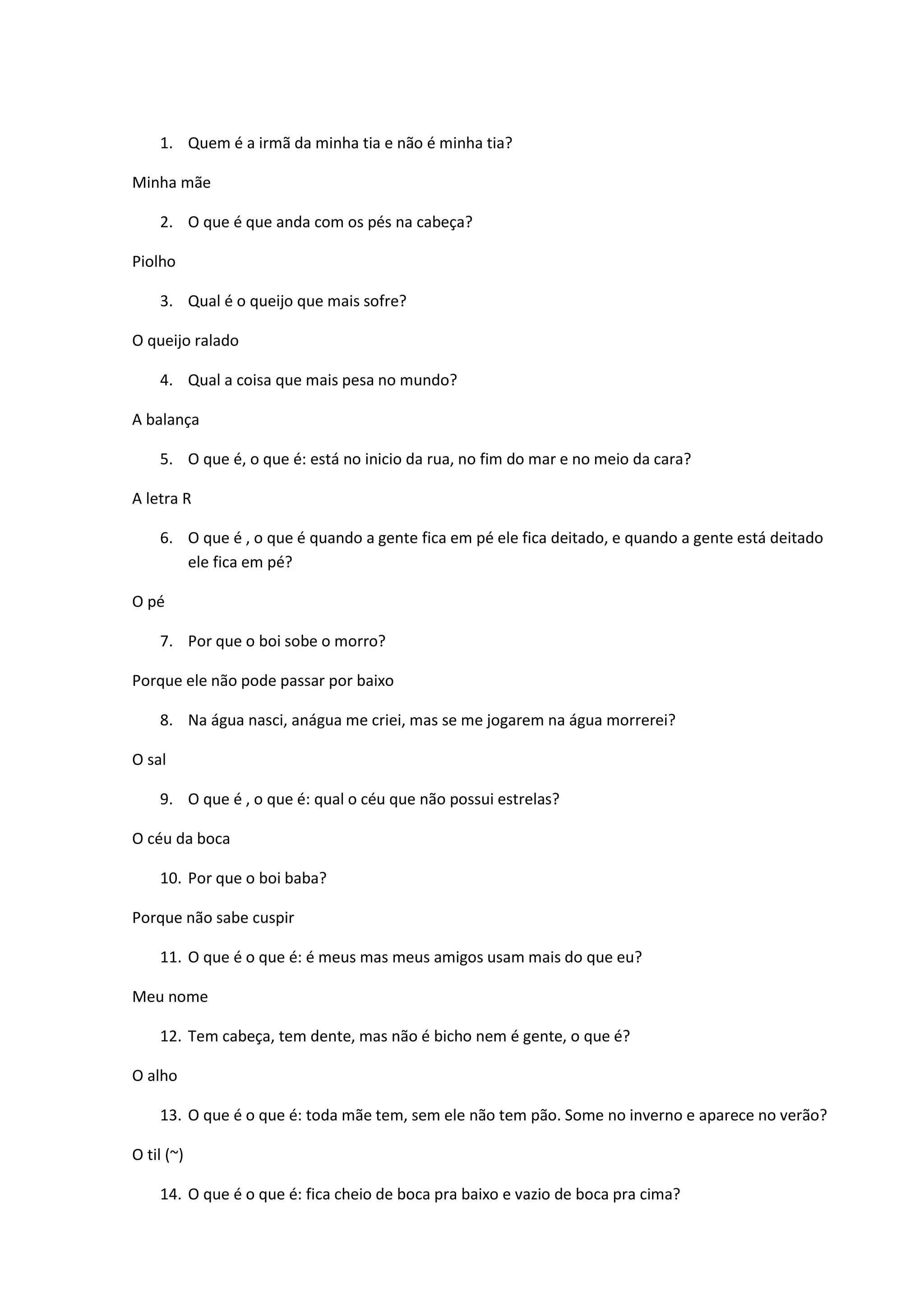 13. O que é o que é: toda mãe tem, sem ele não tem pão. Some no inverno e aparece no verão?
