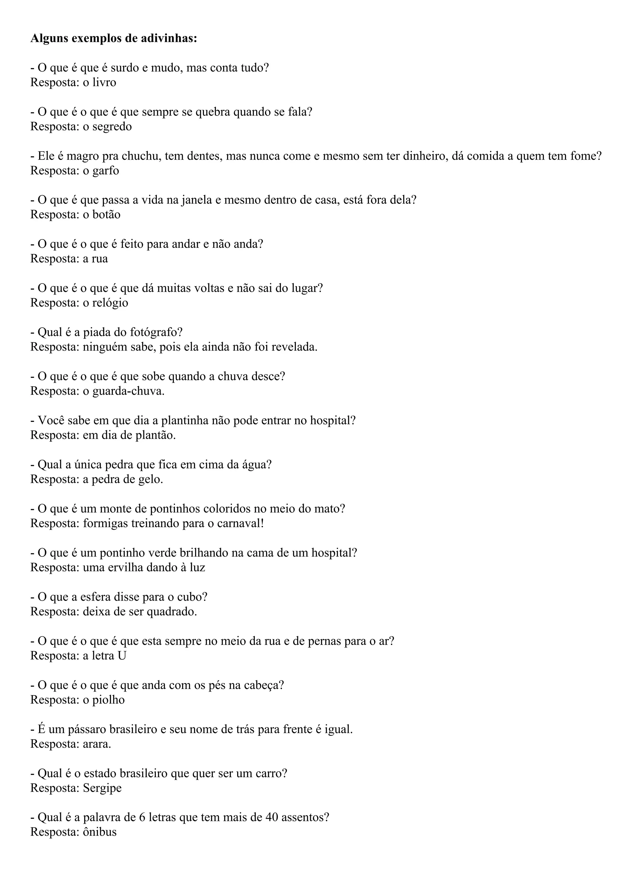 Este documento contém uma coleção de adivinhas e charadas com respostas curtas. As charadas giram em torno de objetos comuns, como livros, segredos, garfos e botões, e brincadeiras de palavras com nomes de lugares como a cidade de Sergipe.