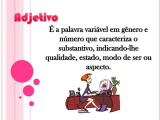 O documento explica que um adjetivo é uma palavra que caracteriza um substantivo indicando sua qualidade ou estado. Adjetivos concordam em gênero e número com o substantivo e podem ser classificados como primitivos, derivados, simples ou compostos. O texto também menciona os adjetivos pátrios, que se referem a países, estados ou localidades.