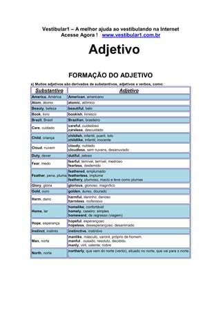Este documento fornece informações sobre a formação de graus e comparação de adjetivos na língua inglesa. Explica como formar os graus comparativo e superlativo de adjetivos de maneira sintética ou analítica, dependendo da estrutura do adjetivo, e fornece exemplos ilustrativos.