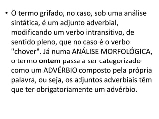 O adjunto adverbial modifica verbos, adjetivos ou advérbios expressando circunstâncias como tempo, lugar, modo, intensidade. Pode vir antes ou depois do termo modificado e é categorizado como advérbio na análise morfológica. Exemplos incluem "Choveu ontem" e "Divórcio tão profundo". Adjuntos adverbiais podem expressar diferentes circunstâncias como tempo, lugar, modo, intensidade, dúvida, causa, finalidade e mais.