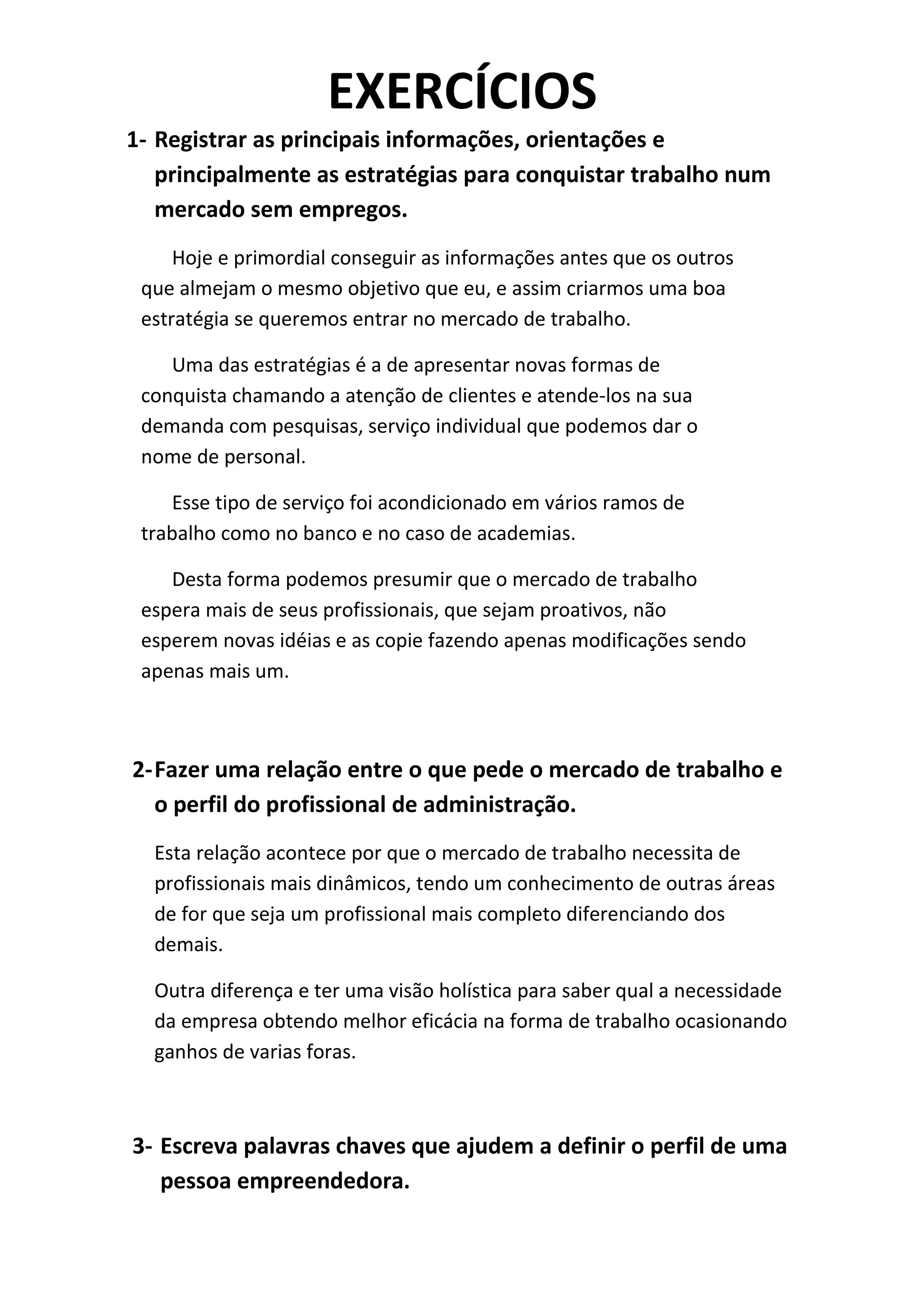 O documento discute estratégias para conquistar trabalho em um mercado competitivo, como apresentar serviços personalizados e atender demandas de clientes de forma individualizada. Também relaciona as habilidades necessárias no mercado de trabalho, como ser dinâmico, ter visão holística e conhecimento em múltiplas áreas. Finalmente, lista palavras-chave para definir o perfil empreendedor, como criatividade, organização, liderança, persistência e busca por inovações.