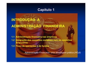 O capítulo introduz os conceitos de administração financeira nas empresas, integração entre contabilidade e finanças, e fluxo de operações e fundos. Aborda objetivos empresariais, atividades operacionais, de investimentos e financiamentos e sua relação com a DRE. Explica ciclos operacional, econômico e financeiro e regimes contábil e de caixa. Por fim, descreve fluxos de bens, serviços, fundos e seus reflexos na contabilidade.