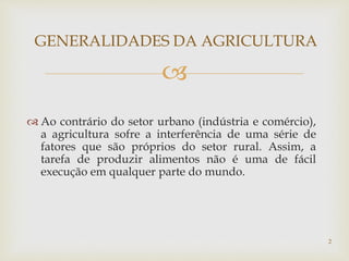 O documento discute as generalidades da agricultura, destacando que a produção agrícola é influenciada por diversos fatores como clima, solo, mercado e é caracterizada pela perecibilidade dos produtos, riscos e estacionalidade.