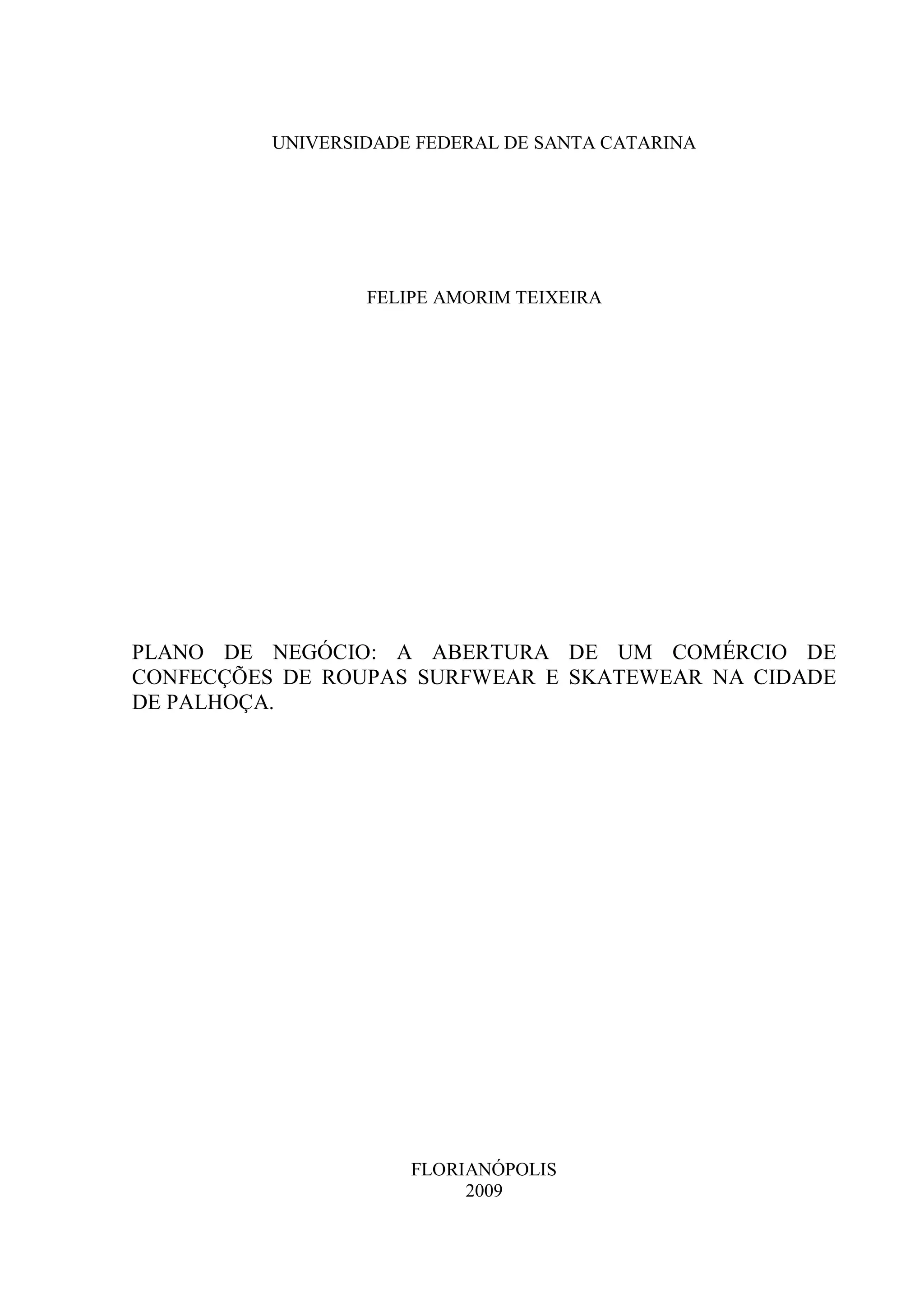 Este plano de negócio descreve a abertura de uma loja de roupas surfwear e skatewear na cidade de Palhoça. O documento apresenta o conceito do negócio, a equipe gerencial, uma análise de mercado incluindo fornecedores, clientes, concorrentes e uma análise SWOT. Além disso, descreve a organização do negócio, o plano de marketing e vendas, o plano financeiro e conclusões da pesquisa de mercado, que indicam viabilidade para o novo empreendimento.