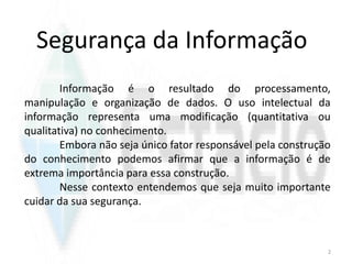 O documento discute conceitos fundamentais de segurança da informação, como confidencialidade, integridade e disponibilidade. Também aborda ameaças comuns como interceptação, interrupção e modificação de dados, bem como formas de proteger informações, como armazenamento digital e computação em nuvem.