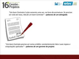 1) O documento discute os principais aspectos da administração de contratos em projetos, incluindo planejamento, formação, administração e fechamento de contratos.
