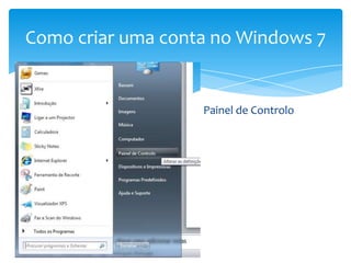 O documento descreve como criar novas contas de utilizador no Windows 7, incluindo contas padrão e de administrador, e como ativar a conta de administrador existente.