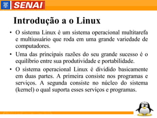 O documento fornece uma introdução abrangente ao sistema operacional Linux, incluindo sua história, estrutura, kernel, licenciamento, distribuições e como entrar e sair do sistema. Ele descreve o Linux como um sistema operacional multiusuário e multitarefa que é dividido em programas/serviços e kernel, e discute o histórico do Unix e do desenvolvimento do Linux.