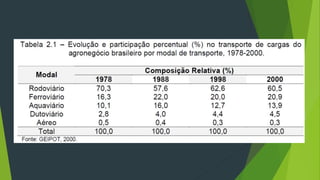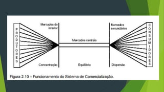 O documento discute os sistemas de comercialização de produtos agrícolas no Brasil. Ele aborda funções de troca e físicas no processo de comercialização, aspectos gerais dos modais de transporte no país, armazenamento, agroindústria e análises funcionais, institucionais e estruturais dos sistemas.