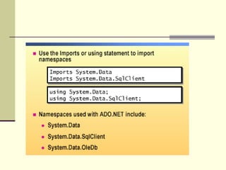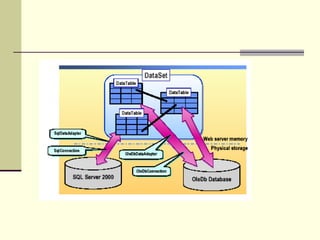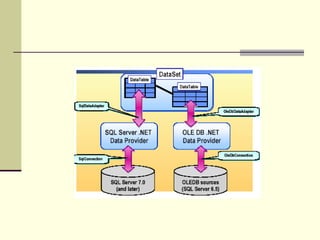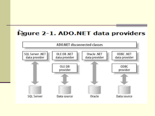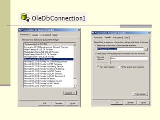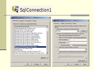 O documento descreve o modelo de objetos ADO.NET, que fornece classes para conexões e manipulação de dados relacionais de forma conectada ou desconectada. Inclui classes para conexões, comandos, leitura e atualização de dados, além de classes para armazenamento e manipulação de dados desconectados em DataSet.