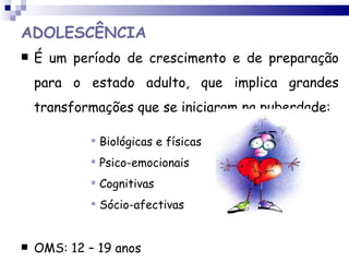 O documento discute a adolescência e a sexualidade. Ele define a adolescência como um período de crescimento entre 12-19 anos, marcado por transformações físicas, psicológicas e sociais iniciadas na puberdade. Detalha as mudanças físicas da puberdade, como o desenvolvimento dos órgãos genitais, causadas por hormônios. Explica que a sexualidade envolve a descoberta de sentimentos como carinho e amor, não se resumindo ao ato sexual. A falta de informação e a ansiedade podem levar