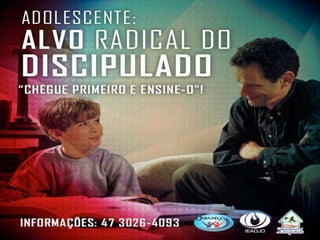 Este documento discute a importância do discipulado de adolescentes. Ele define discipulado como o processo de instrução de um novo convertido para que possa fazer discípulos também. Detalha como formar grupos de discipulado para adolescentes através de sondagem, implantação e desenvolvimento. Também fornece exemplos bíblicos de discipulado e uma estrutura sugerida para reuniões de grupo.