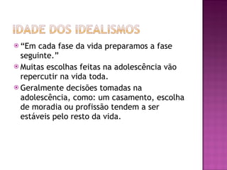 O documento discute as mudanças físicas e psicológicas que ocorrem na adolescência, incluindo a puberdade entre 8-14 anos, quando o corpo fica apto à procriação. A adolescência é um período de reorganização da personalidade entre 10-21 anos influenciado por fatores sócio-culturais. Nessa fase, os adolescentes desenvolvem pensamento abstrato e procuram entender sua identidade e papel na sociedade.