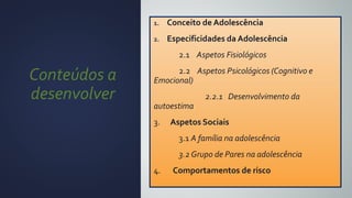 O documento discute os desafios da adolescência, incluindo mudanças fisiológicas, cognitivas e emocionais. Aborda o desenvolvimento da autoestima e a importância das relações familiares e com os pares durante este período. Também menciona comportamentos de risco associados à adolescência.