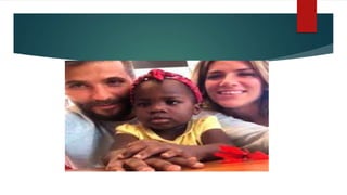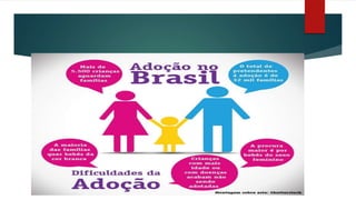 O documento discute a adoção e o apadrinhamento. A adoção é o ato jurídico no qual uma pessoa ou casal assume os direitos e responsabilidades de um indivíduo como filho, mesmo não sendo os pais biológicos. O apadrinhamento permite que pessoas ou empresas contribuam financeiramente para o desenvolvimento de crianças e famílias. A adoção homoparental é legal em alguns lugares e proibida na maioria dos países.
