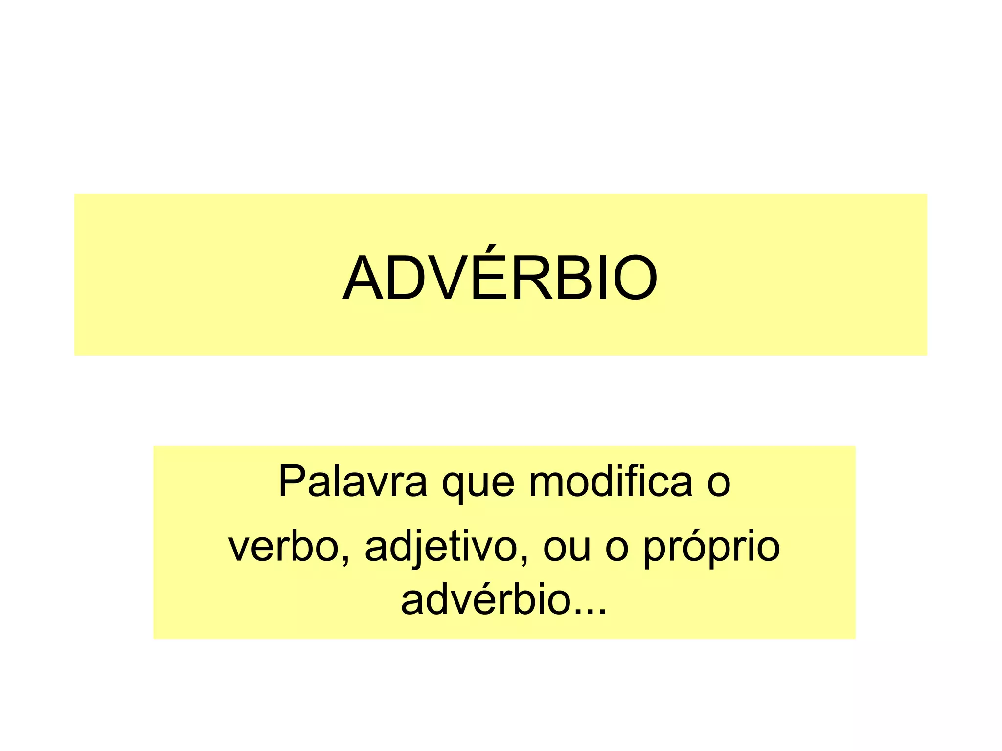 O documento descreve as características e funções dos advérbios em três frases. Primeiro, define advérbio como uma palavra que modifica verbos, adjetivos ou outros advérbios, expressando circunstâncias de tempo, lugar ou modo. Em seguida, fornece exemplos de advérbios de tempo, lugar e modo. Por fim, diferencia advérbios de adjetivos, definindo advérbios como palavras invariáveis que modificam verbos, adjetivos ou outros advérbios, e adjetivos como palavras variáveis que acompanham