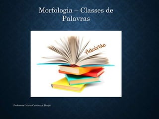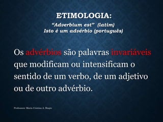 O documento discute as classes de palavras morfológicas, focando nos advérbios. Apresenta a etimologia, definição e exemplos de uso dos advérbios. Classifica os advérbios em categorias como afirmação, negação, dúvida, intensidade, lugar e tempo. Inclui exercícios sobre identificação e uso correto de advérbios e locuções adverbiais.