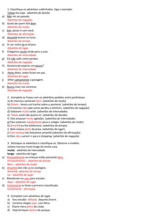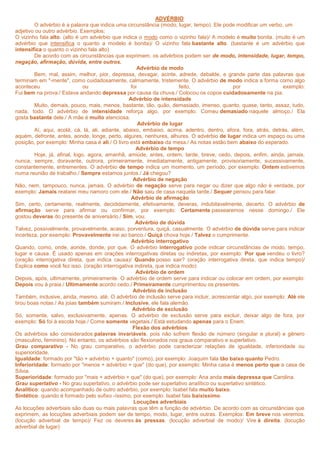 O documento descreve os diferentes tipos de advérbios em português, incluindo advérbios de modo, intensidade, lugar, tempo, negação, afirmação e dúvida. Explica como os advérbios modificam verbos, adjetivos e outros advérbios, e como flexionam no comparativo e superlativo. Fornece exemplos de cada tipo de advérbio.